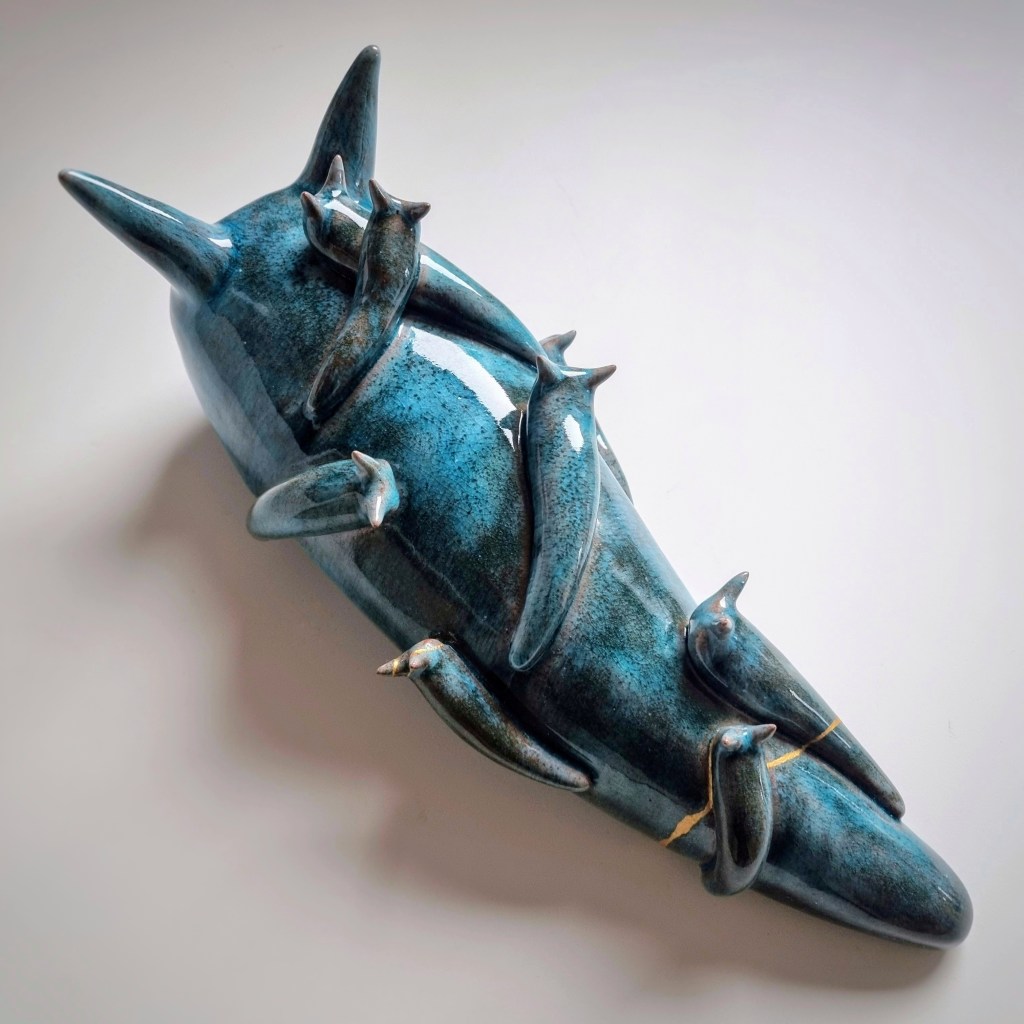 Mega Slug Family, ceramic, glaze, acrylic, wax polish, Kintsugi style tail repair (resin and gold mica). 27x9cm. Forever Home Found