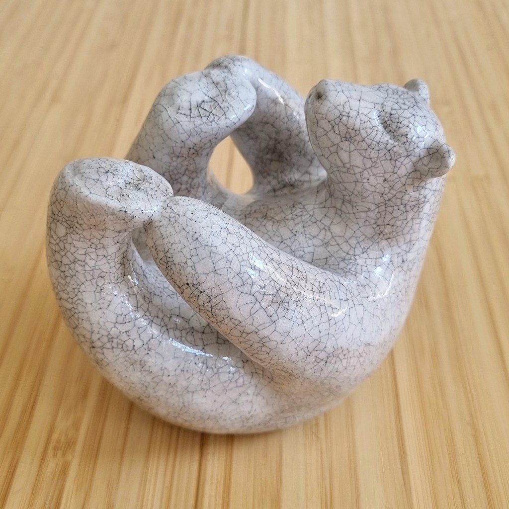 Bear at Play, ceramic, crackle glaze, ink. 10×9.5cm. Forever Home Found