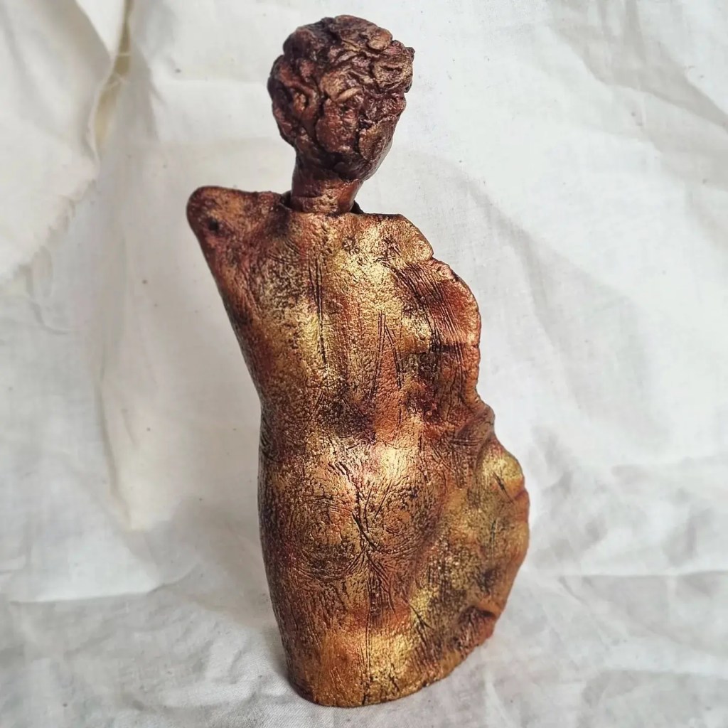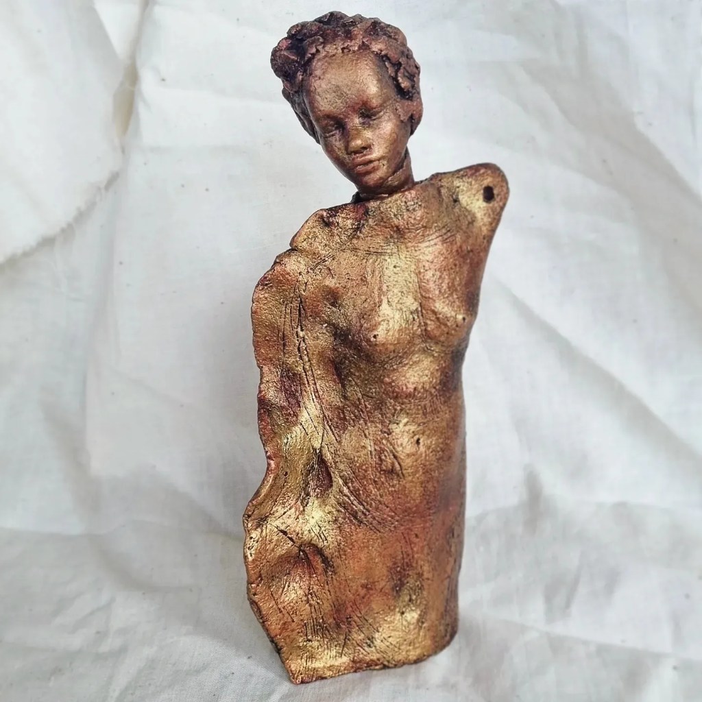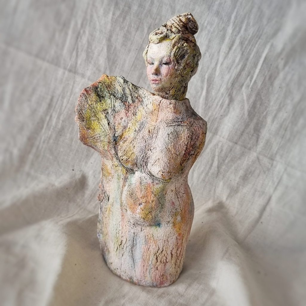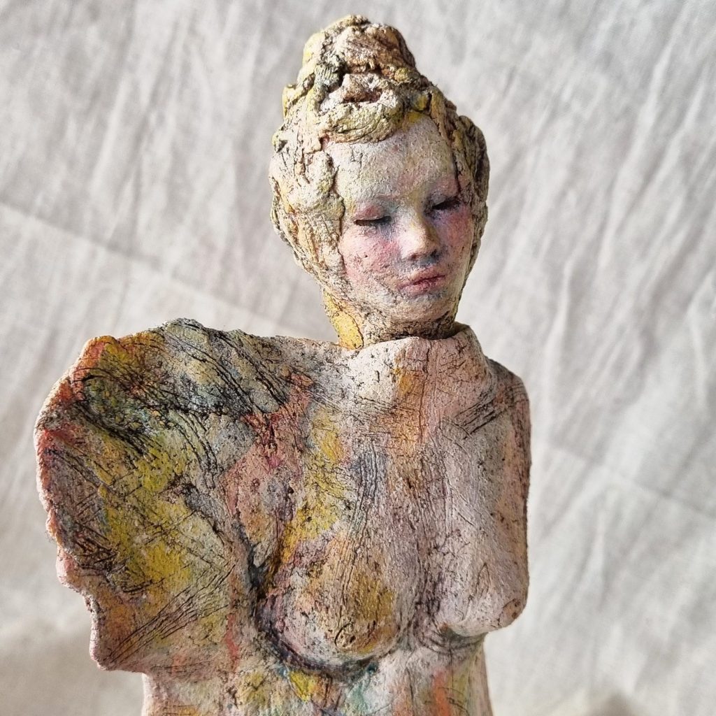 Karen Wilde’s freestanding figurative sculptures weave form and texture into delicate, clay-born narratives. Through expressive surfaces and tactile marks, each piece reveals an intimate dialogue between artist and material. With serene faces and partially nude forms, they invite quiet contemplation, capturing fleeting moments between thought and emotion. Some embody goddess-like strength, blending classical mythology with modern tales of the natural world. These figures hold a watchful presence that lingers beyond the visible.