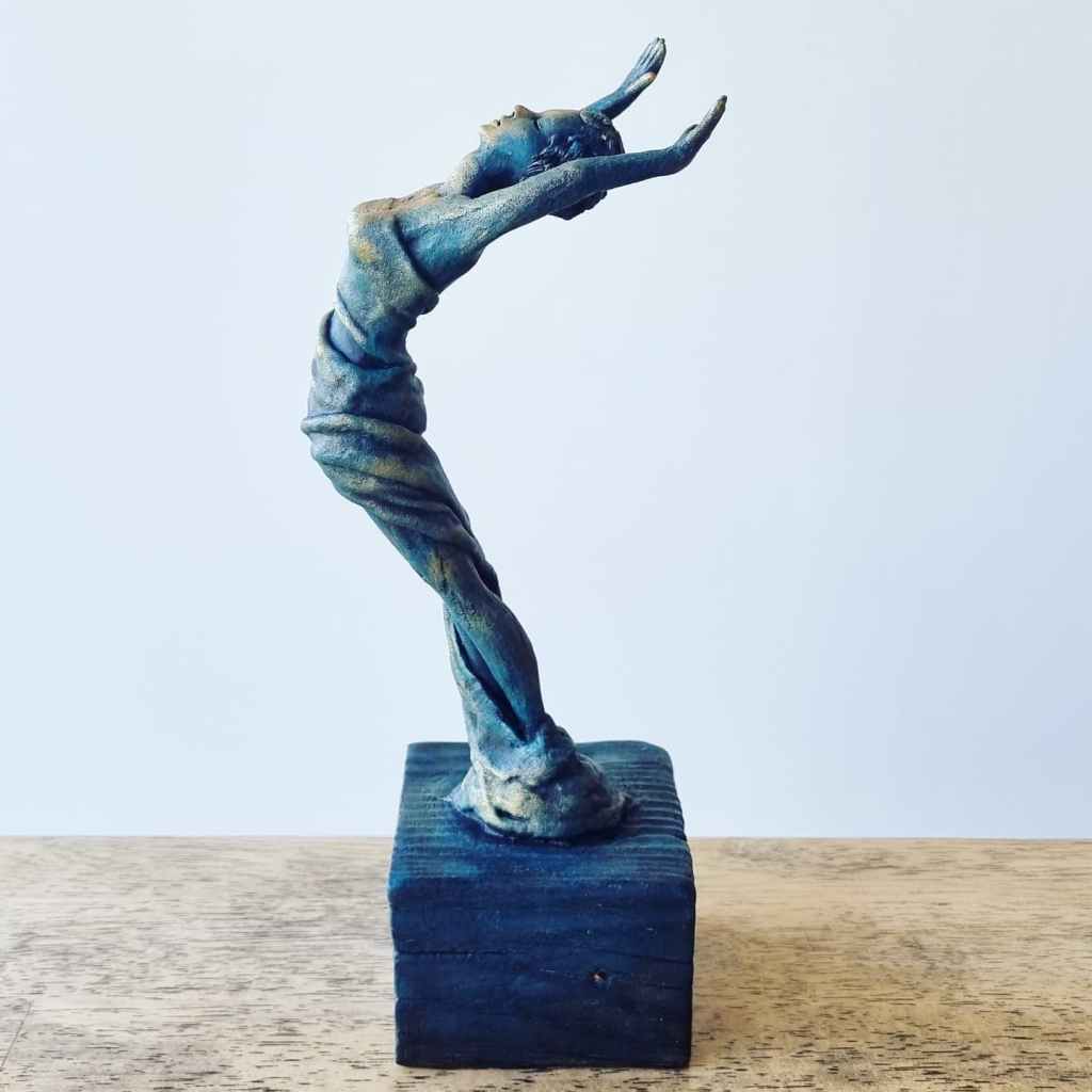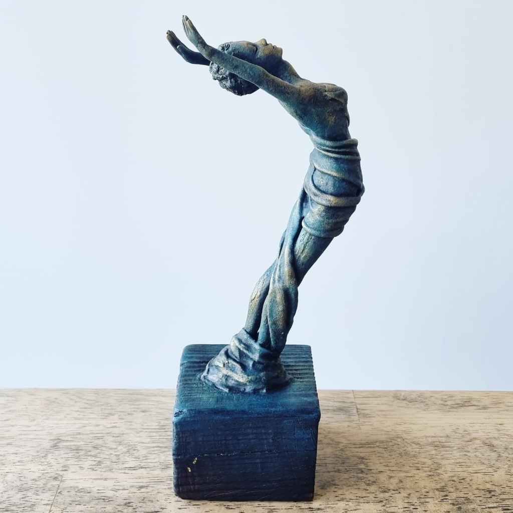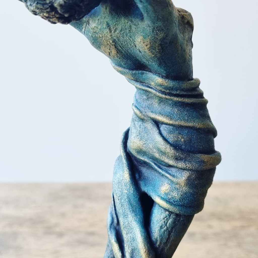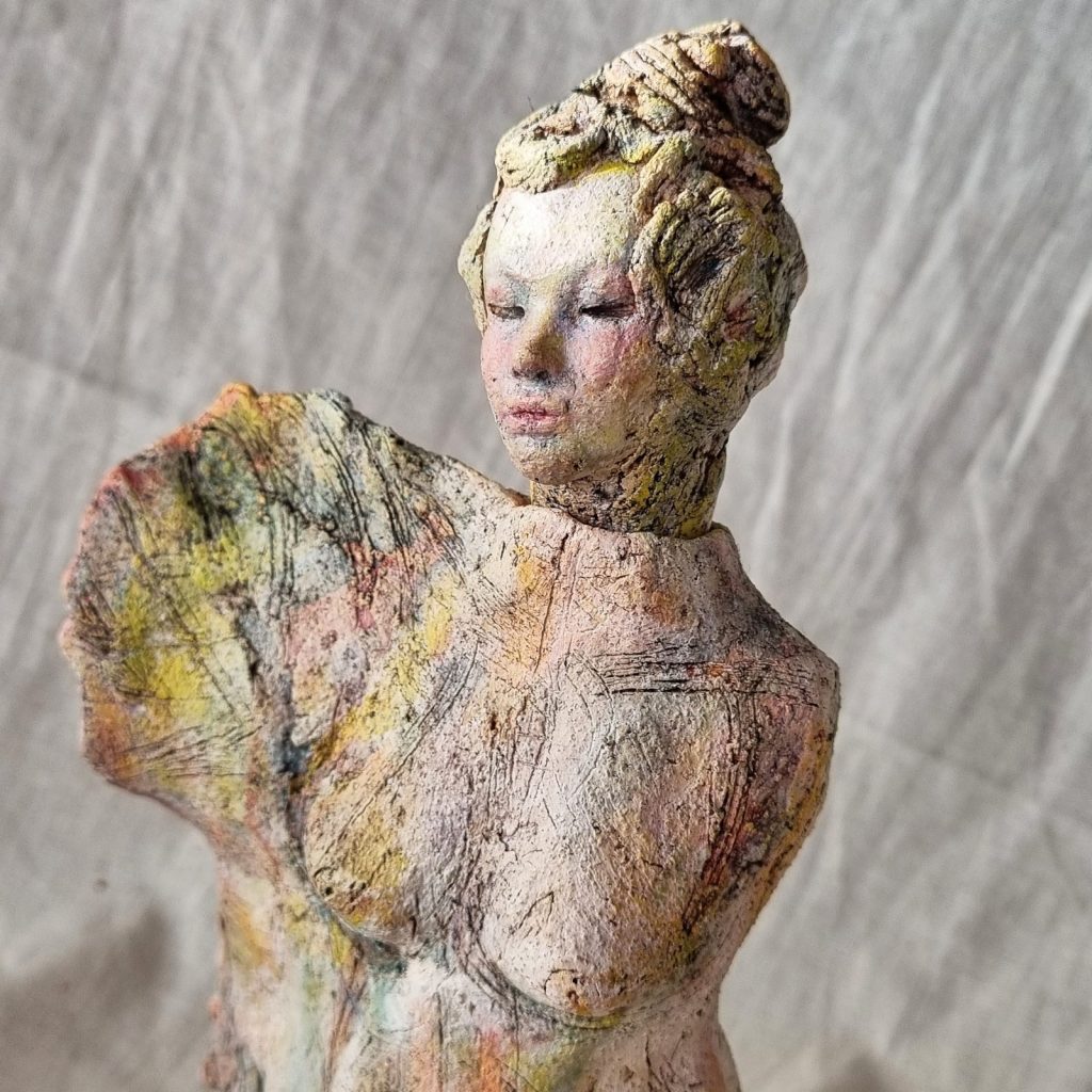 Release, mixed media: ceramic, fabric, plaster, acrylic, mica, wax polish, wood. 29x11x9cm including base. Forever Home Found