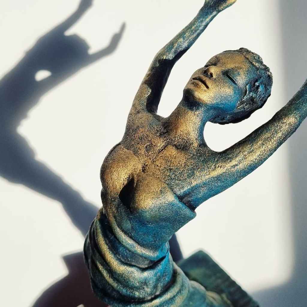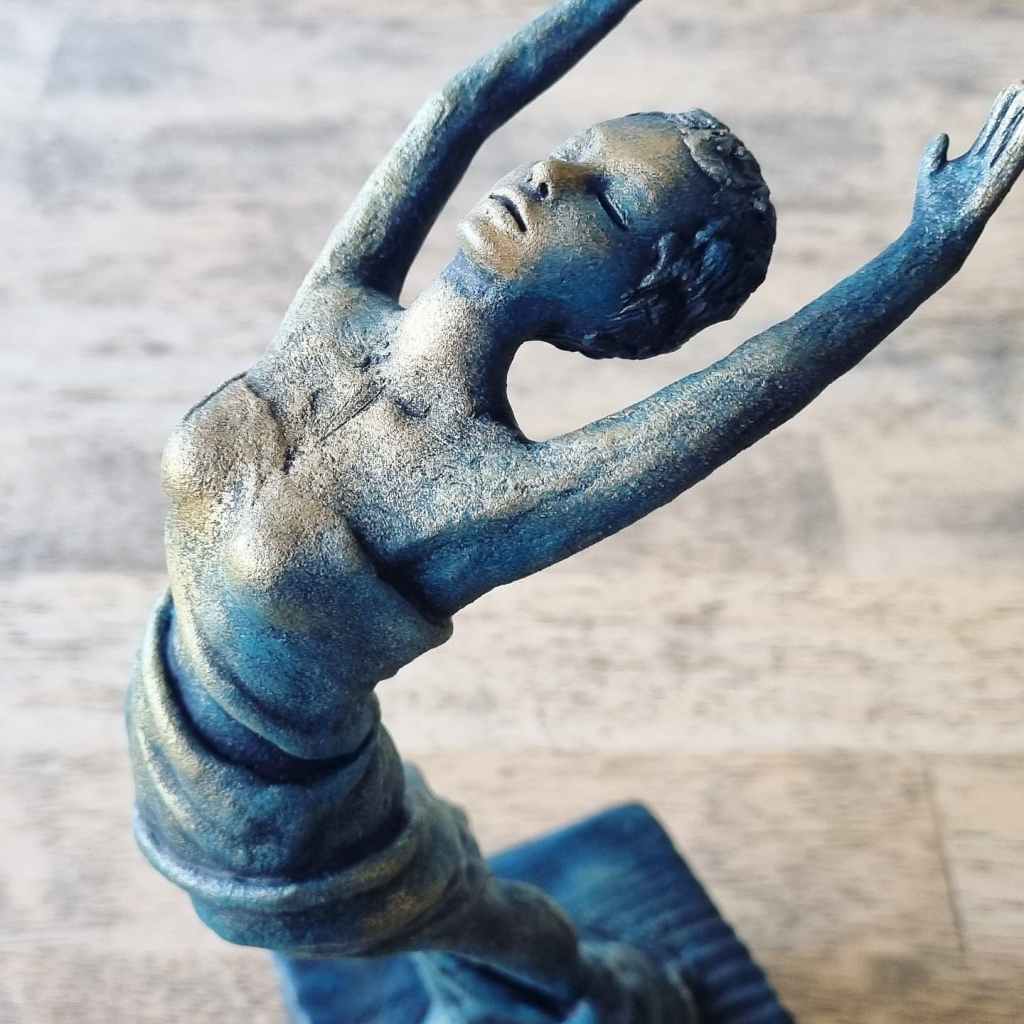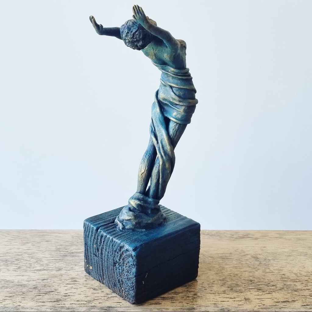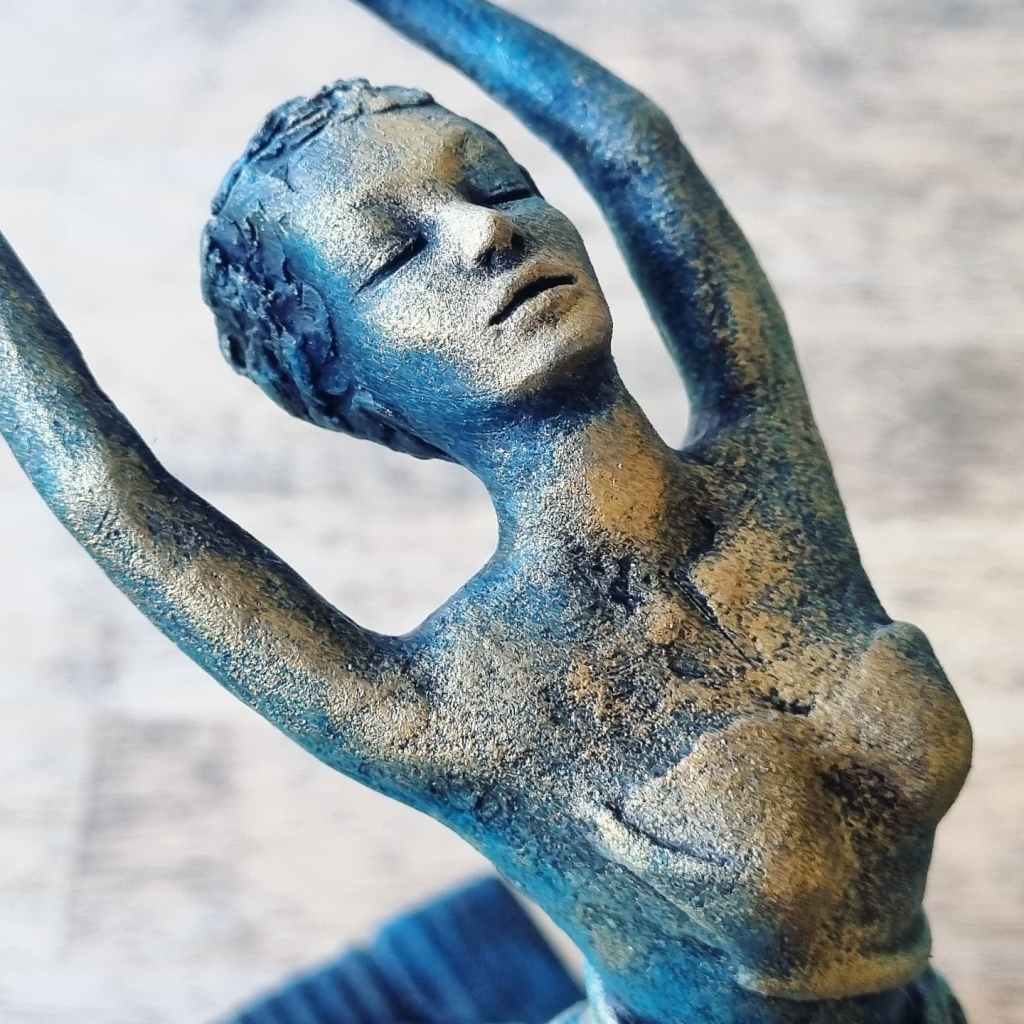 Release, mixed media: ceramic, fabric, plaster, acrylic, mica, wax polish, wood. 29x11x9cm including base. Forever Home Found