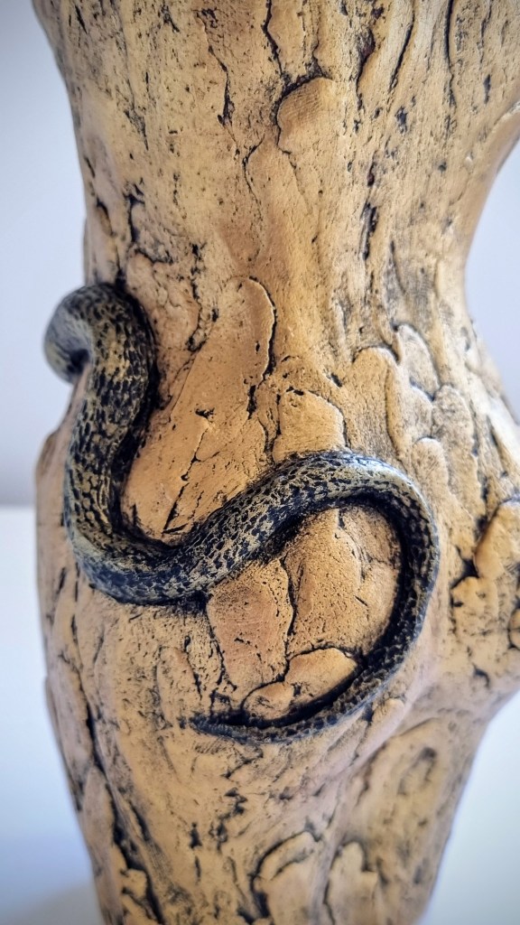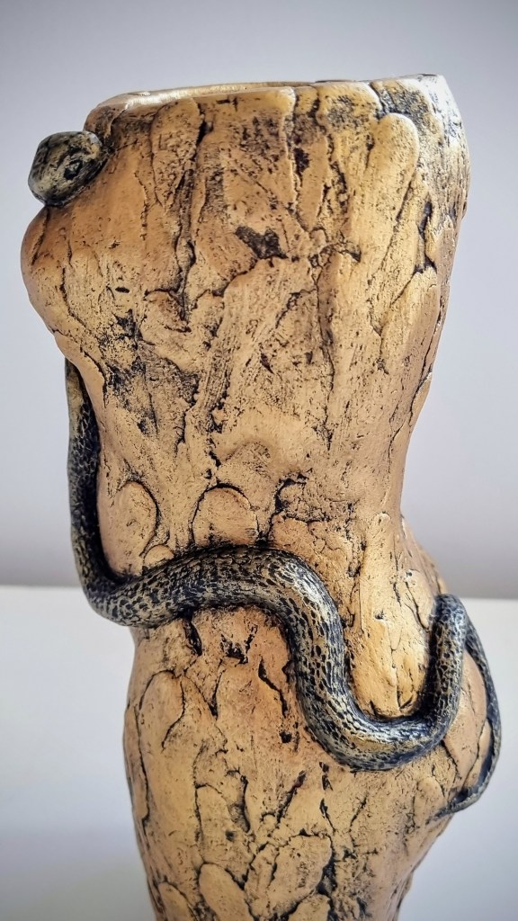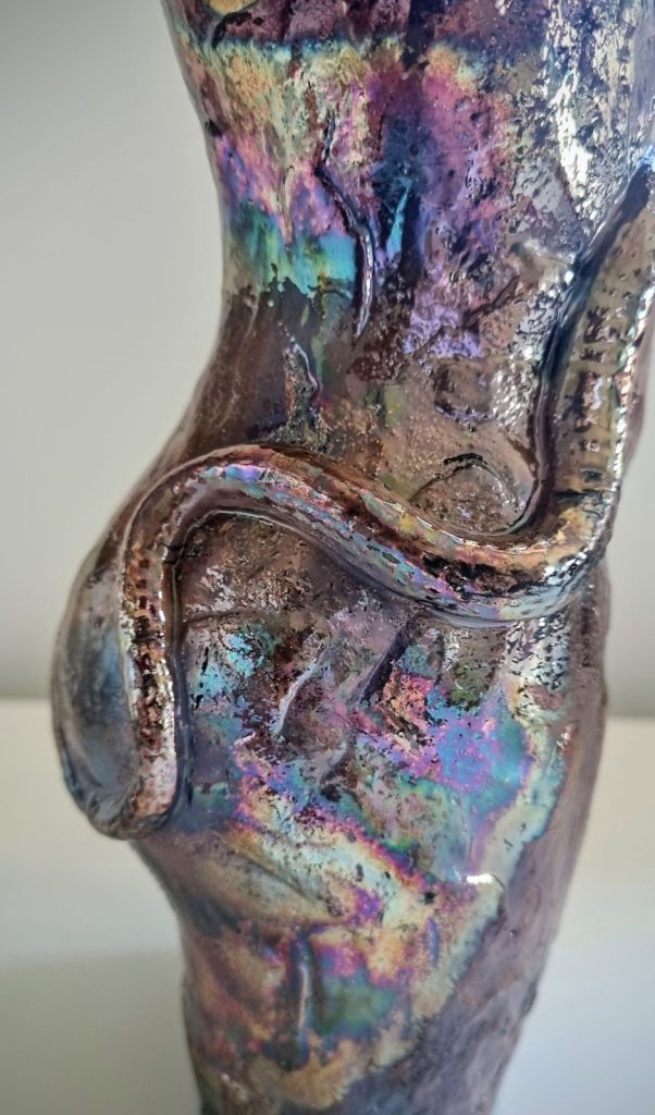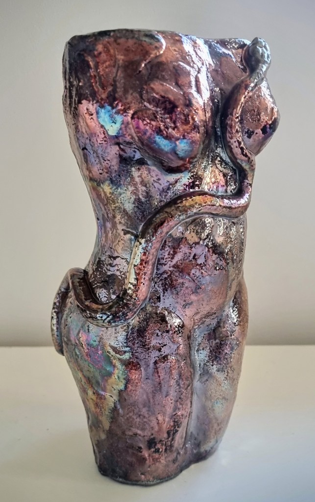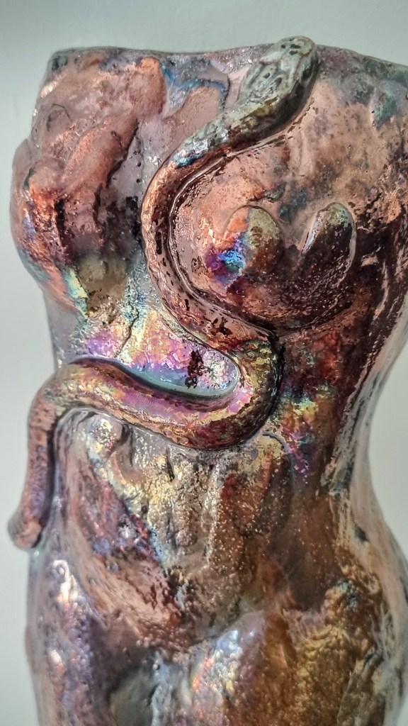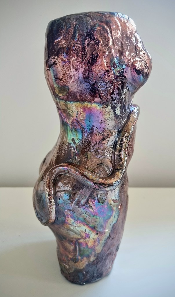 Eve with Snake in Raku Copper Penny and Gold versions, ceramic and glaze / ceramic, cold-finished acrylic and wax polish. 22x9cm. $180-$190